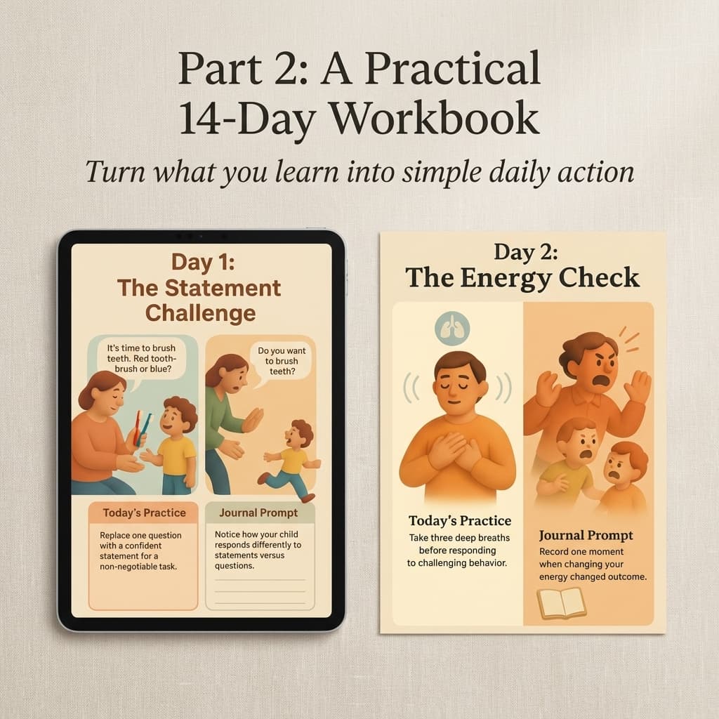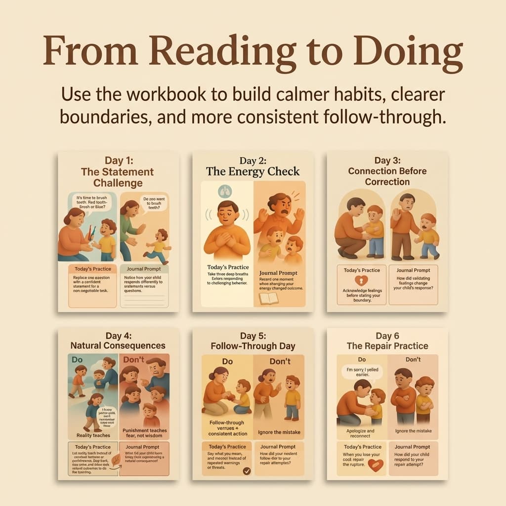 Finally, you move into action with a simple guided rhythm that helps you build calmer parenting habits over the next two weeks.
